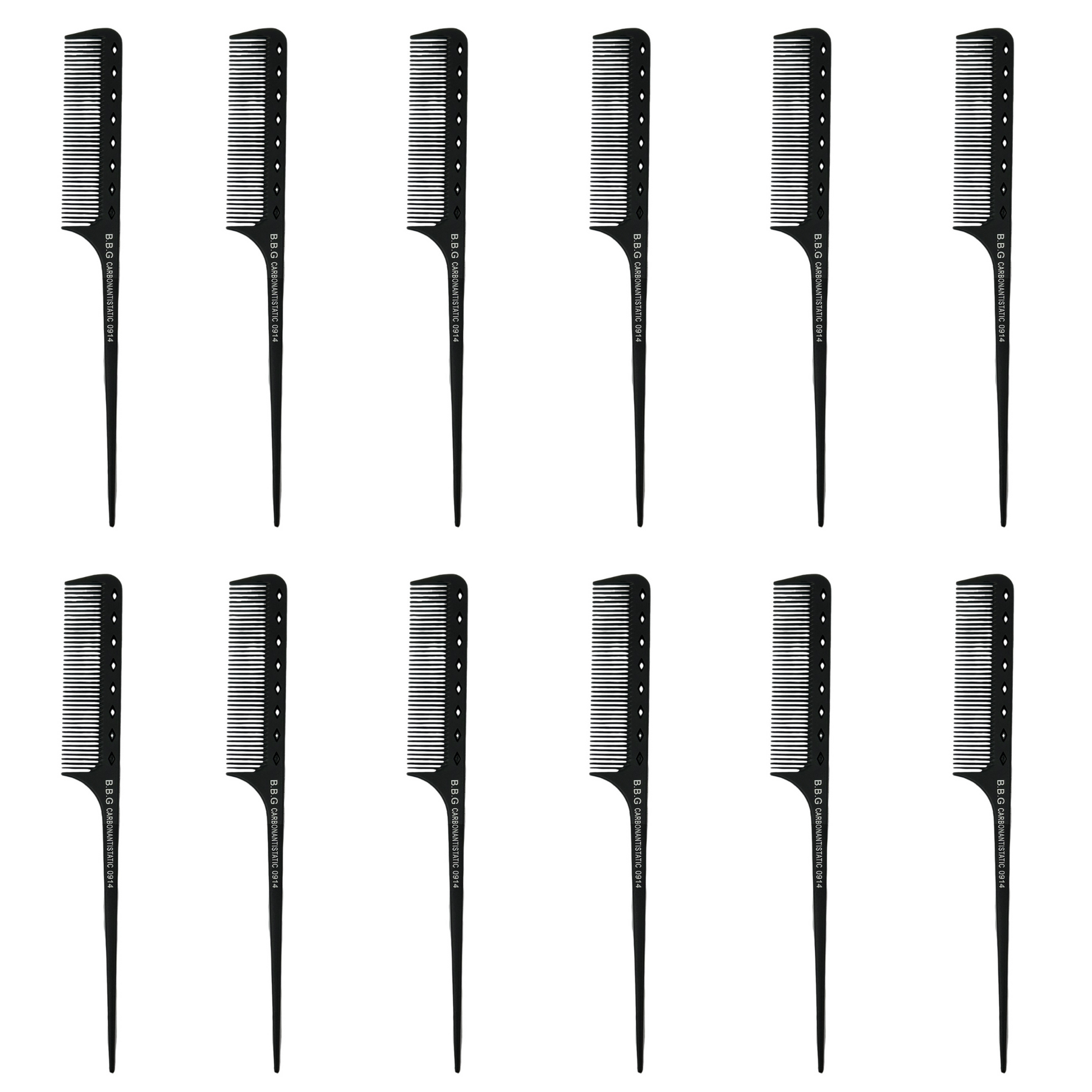 BBG Professional Carbon Comb with Pointed Handle | Medium Teeth 0914 | Black | 12pcs