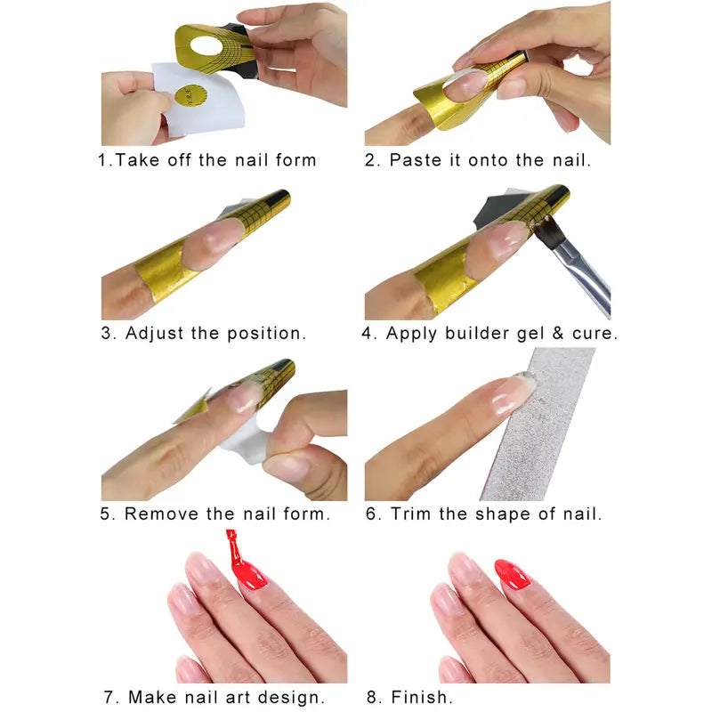 This exclusive set of Golden Rectangle Nail Forms is just the thing for ambitious DIY enthusiasts and learners. With 100 self-adhesive and durable pieces, you can create your own perfect mani/pedi! The numbered tips form guide makes it easy to master the art of nail extensions and the perfect fit for UV Gel. Get creative and make magic!