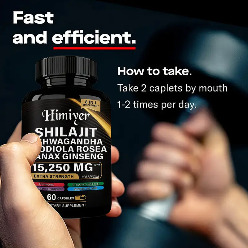 Simplify your wellness routine with Himiyer’s powerful 8-in-1 Shilajit Extra Strength Supplement. Packed with 15,250mg per serving, this premium blend combines Shilajit, Ashwagandha, Rhodiola Rosea, Panax Ginseng, Turmeric, Ginkgo Biloba, Cordyceps Mushroom, and Stinging Nettle for energy, vitality, and overall health. Replace multiple supplements with one convenient solution in a bottle of 60 easy-to-swallow capsules. Perfect for those seeking enhanced stamina, focus, and well-being.