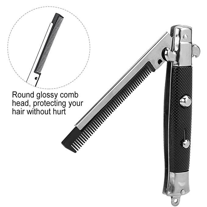Tow Switch Buttons : The switchblade comb has a button spring design, you can easily press them to open or close the comb. Slide down the small button to unlock then push button for quick blade comb with handle ejection.